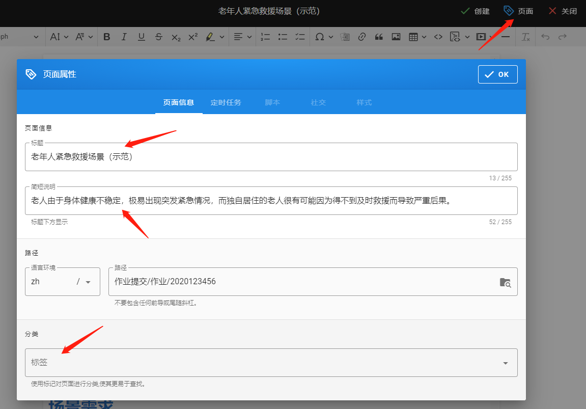 只能在智慧养老课程文件夹下创建新页面。路径名(new-page)不可重复,可改为自己的学号。即路径名为“/智慧养老课程/2020123456”。