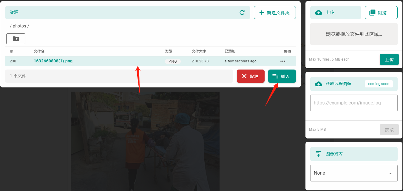 选中上传图片,并点击插入。即可插入图片。
